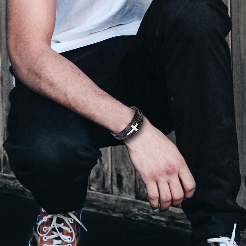Das Armband besteht aus hochwertigem schwarzen Rindleder, das in fünf Strängen kunstvoll geflochten ist. Das zentrale Highlight bildet das silberne Edelstahl-Kreuzelement, das dem Armband eine tiefe symbolische Bedeutung verleiht.